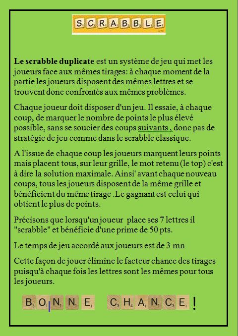 Le scrabble pratiqué est le scrabble duplicate . Il se joue individuellement maisà la